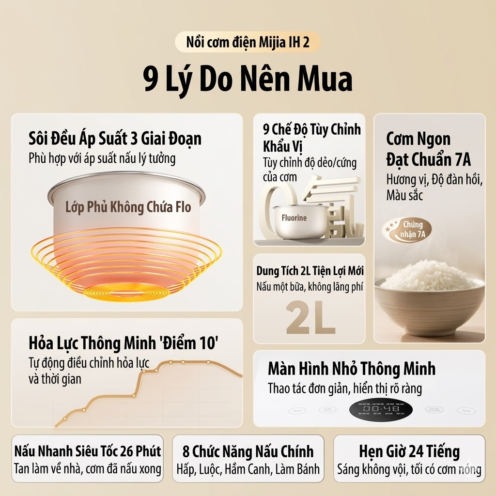 Nồi cơm điện Mijia IH 2 tích hợp thêm nhiều tính năng, bao gồm hẹn giờ 24 tiếng, chức năng giữ ấm 12 tiếng và bảng điều khiển cảm ứng phía trên có màn hình hiển thị. Xiaomi đã nâng cấp bộ phận chống trào bọt để ngăn ngừa tràn khi nấu cháo hoặc súp. Thiết kế có thể tháo rời giúp việc vệ sinh dễ dàng hơn.